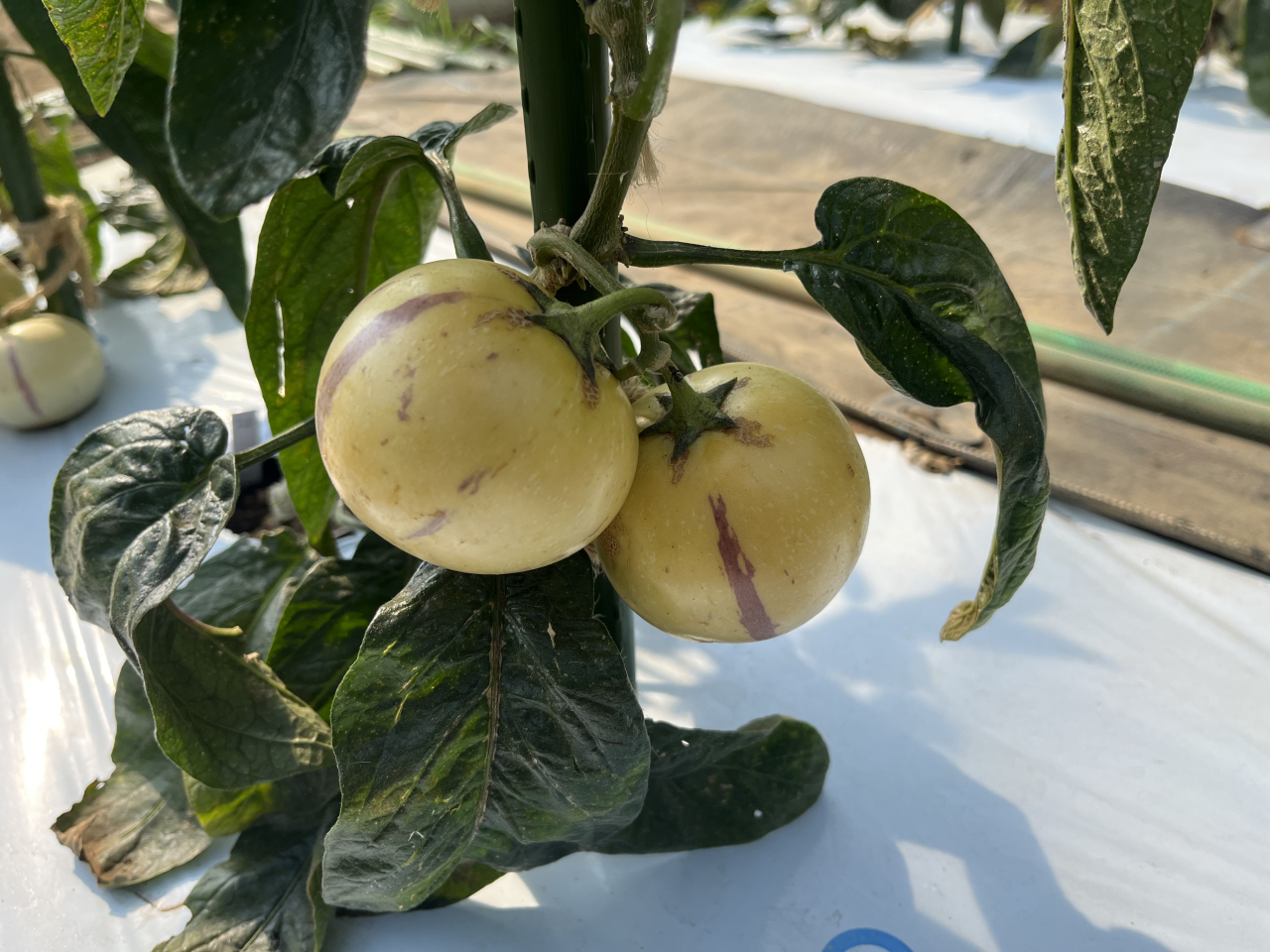 定植時に既に果実の着果が見られた株に関しては,右の写真のように黄色い果実に紫色の縞がきれいに入っており,もうじき収穫できます.