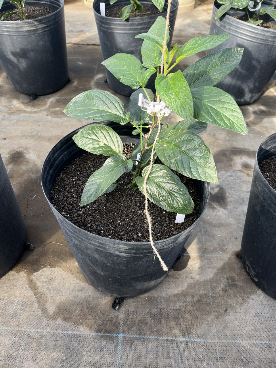 定植を行った後は,誘引するための紐を設置します.ペピーノの果実は1個当たり200gほどの重さになります.植物体が折れないようにするためにも誘引は欠かせません.